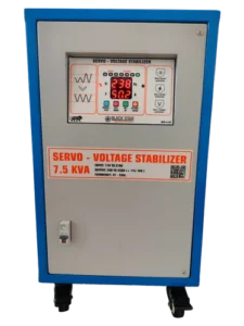Servo voltage stabilizer with 7.5 kVA capacity, precise automatic voltage regulation, fast response correction, low distortion, robust design, and reliable protection for industrial equipment.
